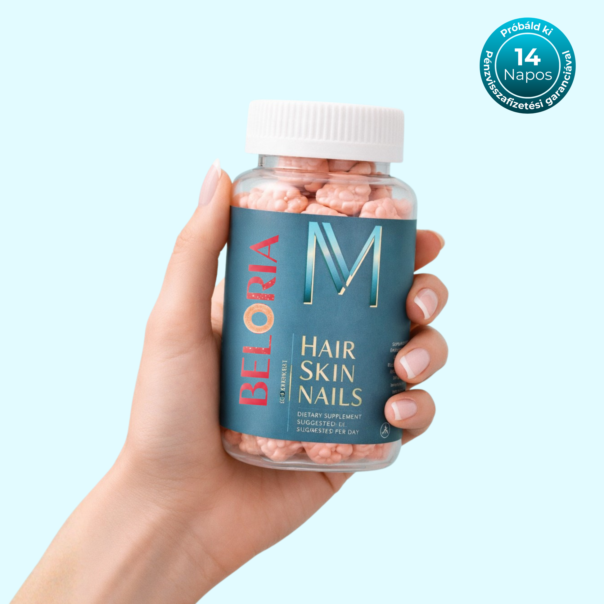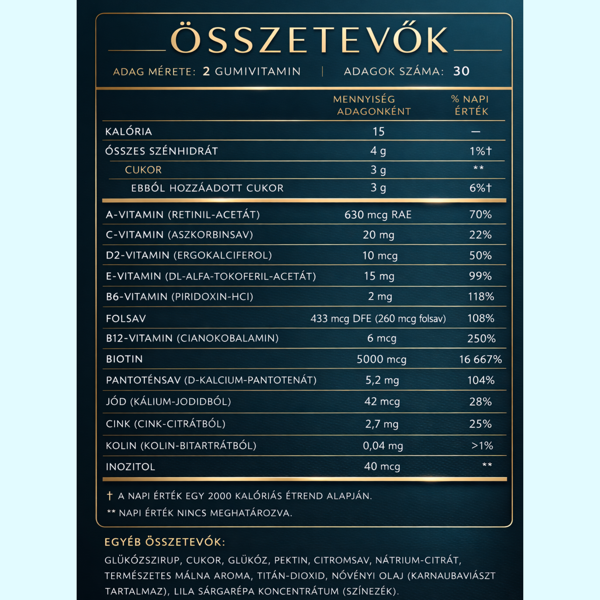 A gumicukor biztonságosan hatékony összetevőket tartalmaz, amelyek segítenek a hajritkulás, a törékeny körmök és a problémás bőr ellen.